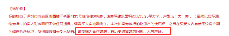 房源建面约35.25㎡,户型为大一房,目前在租状态。值得注意的是,项目处于拆迁旧改范围,在标的物详情描述中明确提到“买受人占有使用该房产期间如遇拆迁征地,所得赔偿归买受人所有”。