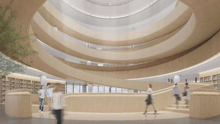 图书馆通高中庭的采光由天窗提供,圆形天窗采用阶梯状环形分布,设置高侧窗,将自然光温柔地漫反射至中庭螺旋楼梯及周边区域,有效避免了大面积透明天窗带来的过热及眩光问题。