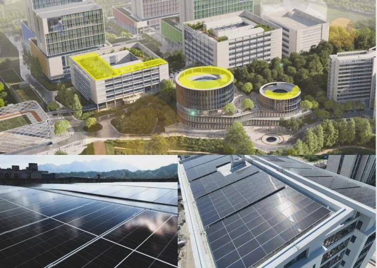 项目在7栋教学大楼、9栋图书馆和行政楼、13-15栋学生书院、18栋科研大楼屋面铺设光伏组件,并设置了光储充一体化系统、光储直柔系统、太阳能热水系统,综合利用太阳能资源。
