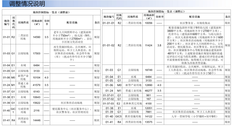 01-03地块面积由17503平方米调整为18749平方米,01-06地块面积由10104平方米调整为12890平方米,01-24地块面积由41579平方米调整为48277平方米,01-38地块面积由10643平方米调整为12051平方米,01-39地块面积由15622平方米调整为7881平方米,配套设施增设一处环卫工人休息房,01-41地块面积由14446平方米调整为13575平方米。上述地块的其他规划要求不变。