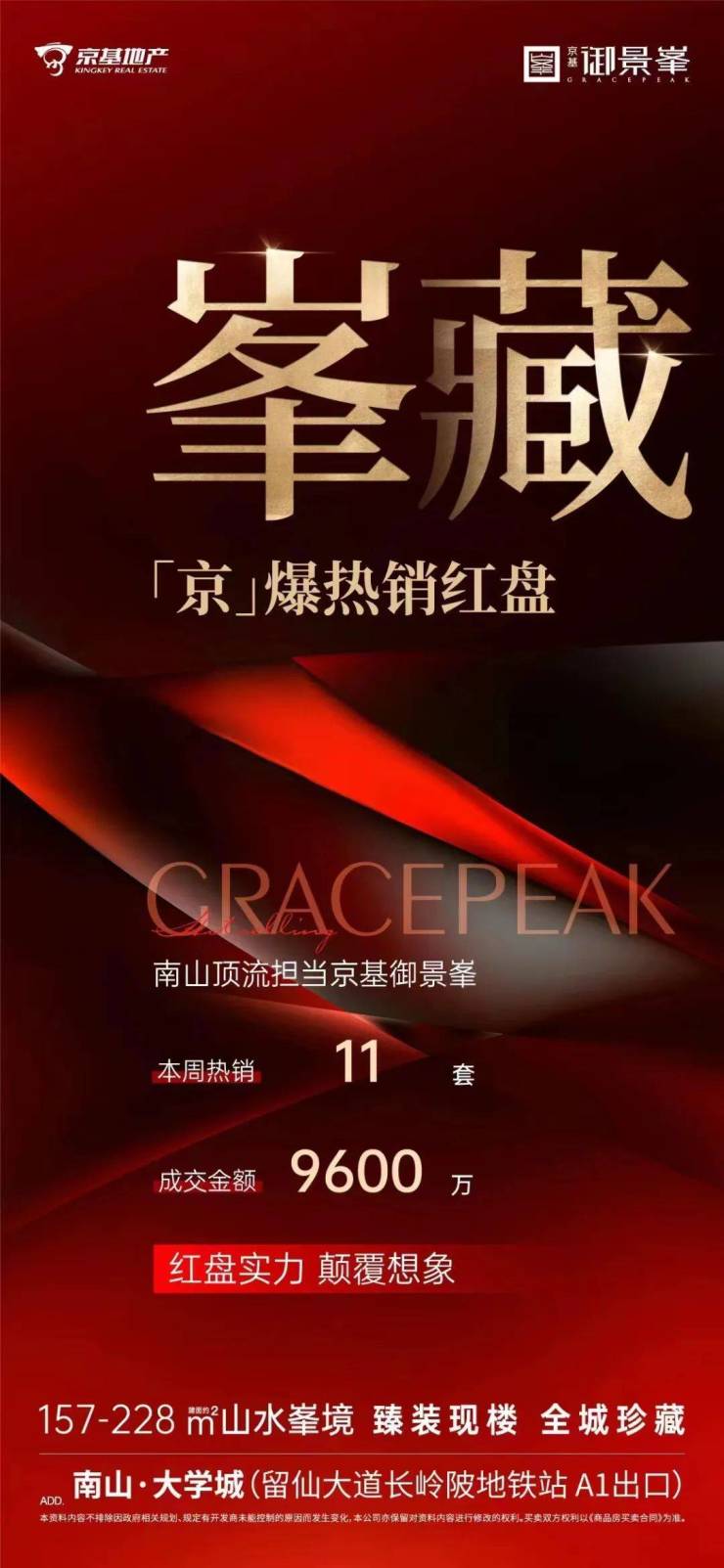 位于西丽的大学城片区的京基御景峯,上周热销11套房源,这样的成绩,正如其海报所说,堪称南山公寓界的顶流。