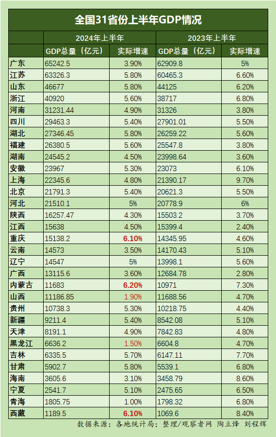 31省份“半年报”:上半年18省跑赢全国增速,广东“失速”