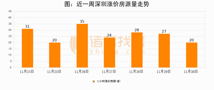 根据诸葛找房数据显示,深圳24小时涨价房源量为20套,较11月29日减少7套,环比下降25.9%。与此同时,涨价房源占比小幅回落,对于购房者来说是一个入市窗口期,购房者可抓住时机入市。
