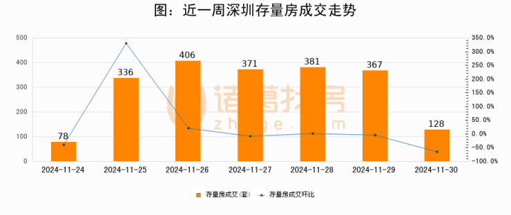 从存量房来看,2024年11月30日深圳存量房单日成交128套,比昨日减少239套,环比下降65.1%。从近一周存量房成交来看,深圳存量房日均成交套数为295套,11月30日单日成交128套,低于近一周平均水平56.6%。