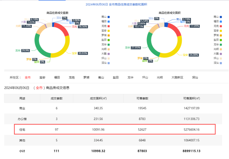 2024年6月6日新房住宅共网签97套。宝安30套;福田0套;龙岗18套;罗湖0套;南山2套;盐田0套;龙华29套;坪山6套;光明11套;大鹏1套;深汕0套。
