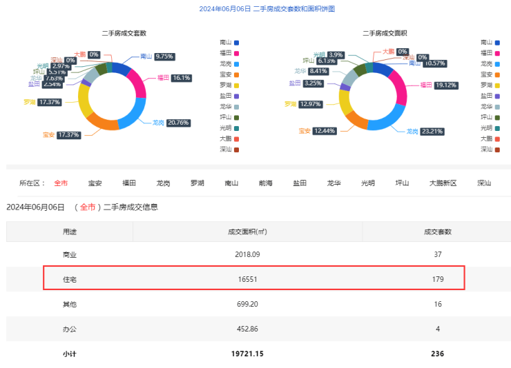 2024年6月6日二手房住宅网签179套。宝安22套;福田32套;龙岗46套;罗湖31套;南山17套;盐田5套;龙华16套;光明5套;坪山5套;大鹏0套。