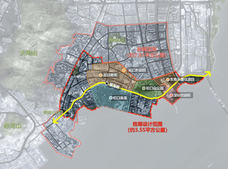 蛇口湾片区分布有深圳歌剧院、蛇口山音乐公园、东角头居住项目、望海路快速化改造、蛇口渔港升级改造、蛇口影剧院升级改造、蛇口老街改造提升七大重点项目。