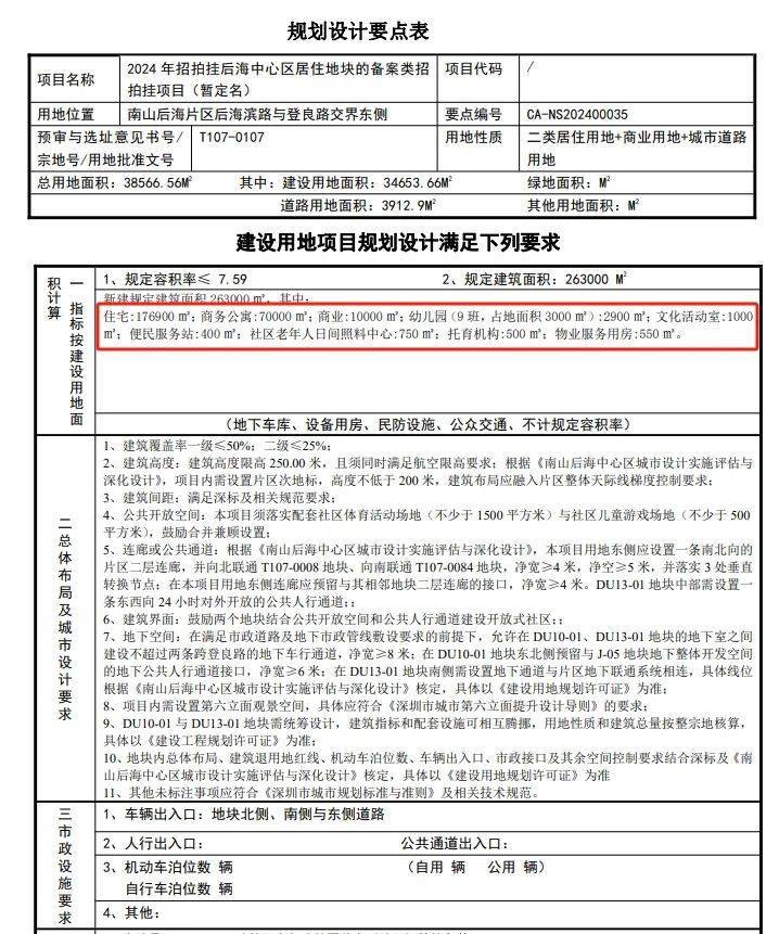 根据规划设计要点表显示,住宅176900㎡,商务公寓70000㎡,商业10000㎡,9班幼儿园(占地面积3000㎡)2900㎡,文化活动室1000㎡,还有便民服务站、社区老年人日间照料中心、托育机构、物业服务用房等。