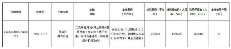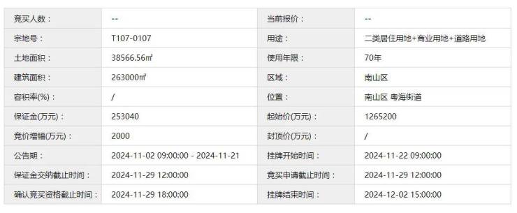 11月2日,后海宅地(T107-0107)正式挂牌,该地块预计12月2日15:00时出让,挂牌起始价126.52亿元。