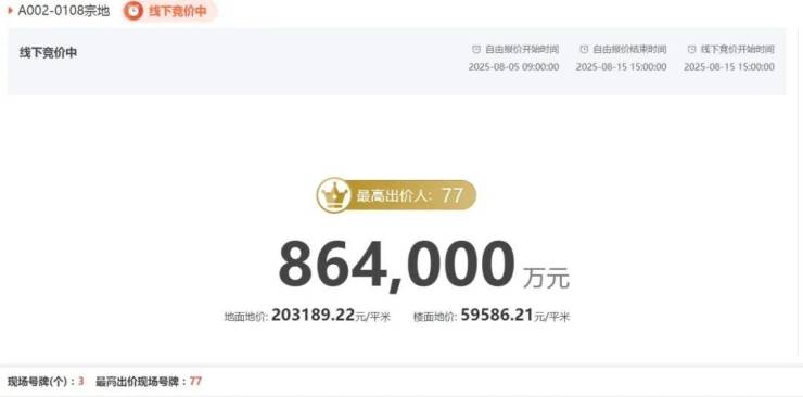 土拍开始,77号华润+招商联合体率先举牌,加价1100万,为64.2亿。