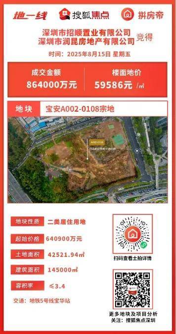 8月15日,宝中A002-0108宅地,即南街坊地块成功出让,三家房企报价190轮,最终华润+招商联合体以86.4亿将该地块收入囊中。