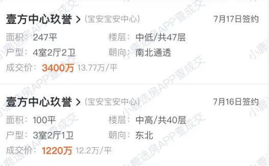 据小鹿选房近期成交数据,壹方中心玖誉7月成交的一套建面约247㎡大户型成交单价约13.8万/㎡;约100㎡的产品成交单价约12.2万/㎡。综合来看,大面积段的改善户型价格更高。