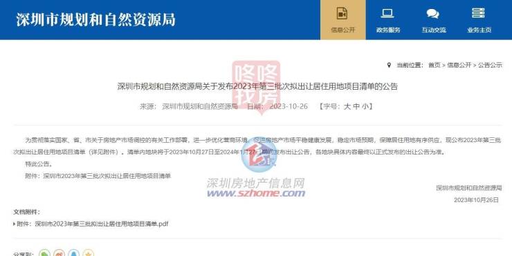 10月26日晚, 深圳市规划和自然资源局公布2023年第三批次拟出让居住用地项目清单的公告。