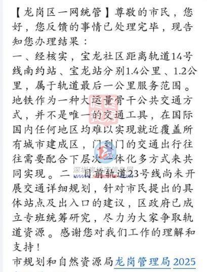 宝荷片区市民提到,宝荷片区作为宝龙街道新兴居住片区,人口近10万,但深圳地铁14号线南约站难以覆盖,建议深圳地铁23号线在片区增设站点。