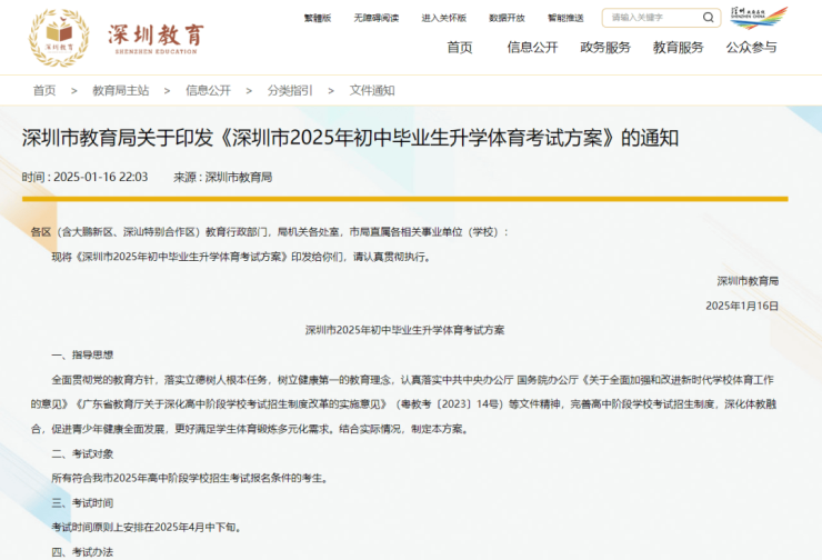 今年初,深圳市教育局官网公布了《深圳市2025年初中毕业生升学体育考试方案》。