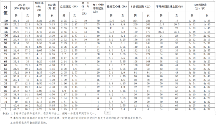 ◆200米跑,男生26.4秒、女生32秒可得120分,较去年标准均增加1.6秒;男生29.2秒、女生34.8秒可得100分,较去年标准均增加1.2秒。