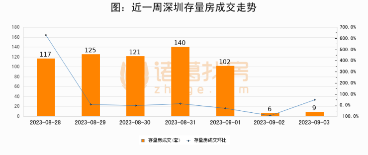 从存量房来看,2023年09月03日深圳存量房单日成交9套,比昨日增加3套,环比上涨50%。从近一周存量房成交来看,深圳存量房日均成交套数为88套,09月03日单日成交9套,低于近一周平均水平89.8%。
