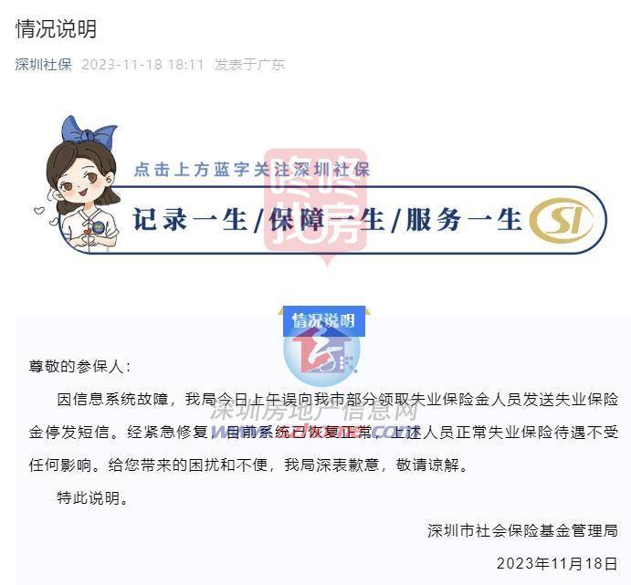 《情况说明》表示,因为信息系统故障,深圳市社会保险基金管理局11月18日上午误向深圳市部分领取失业保险金人员发送失业保险金停发短信。经紧急修复,目前系统已恢复正常,上述人员正常失业保险待遇不受任何影响。