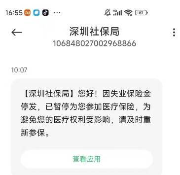 11月18日上午,网上有不少深圳市民表示,收到一则短信,由深圳社保局发出,该条短信表示,因失业保险金停发,已暂停向短信接收人参加医疗保险,为避免短信接收人的医疗权力受影响,请及时新参保。