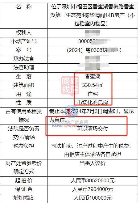 该套法拍房建面330.54平方米,原为前业主自住,可以清场交付。