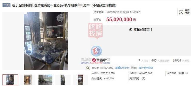 10月12日,香蜜湖第一生态苑(香蜜湖壹号)4栋华晴阁一豪宅法拍房成功拍出,拍卖价5502万元,现场共吸引7人竞拍,竞拍56轮,约1.5万人围观。