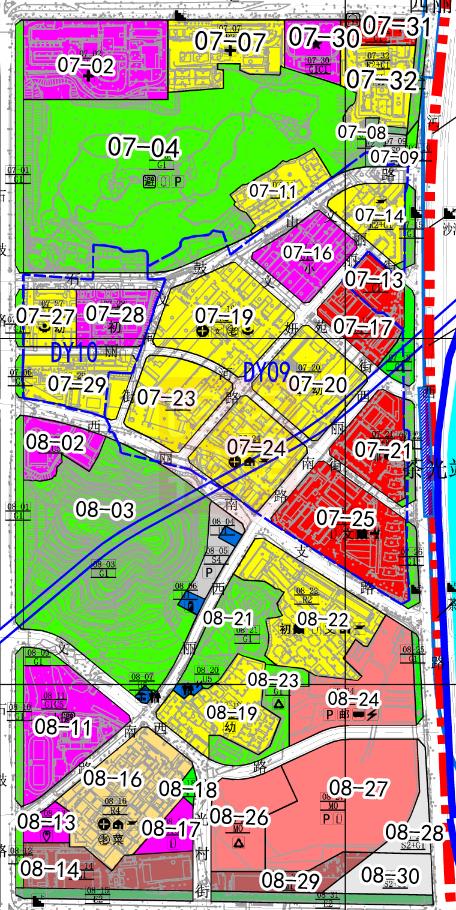 DY10 子单元具体包含 07-27、07-28、07-29、07-30、07-31、07-32 地块,该 单元若进行改造,需配置一处 18 班初中及一处幼儿园、一处社区服务中心。 若 DY09 和 DY10 合并开发,可在学校班数不减少的前提下统筹安排落实学 校。