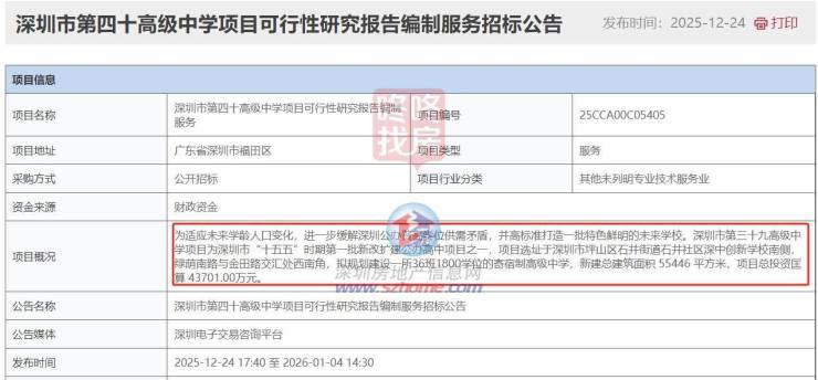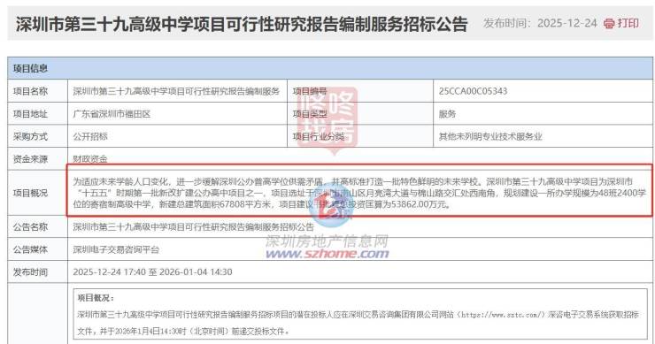据悉,四所学校均为深圳市“十五五”期间重点建设项目。其中,据招标公告显示,第三十九、第四十高级中学已明确为“十五五”时期第一批新改扩建公办高中项目。