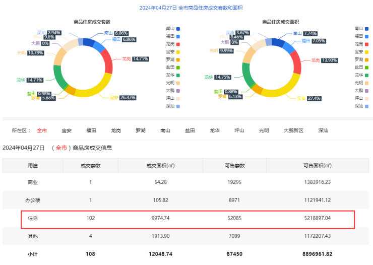 2024年4月27日新房住宅共网签102套。宝安27套;福田7套;龙岗15套;罗湖6套;南山7套;盐田1套;龙华15套;坪山10套;光明11套;大鹏0套;深汕3套。