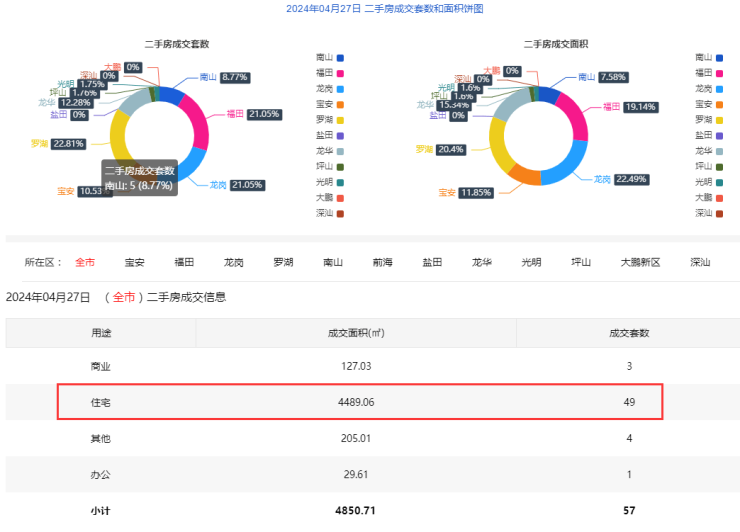 2024年4月27日二手房住宅网签49套。宝安6套;福田6套;龙岗11套;罗湖12套;南山5套;盐田0套;龙华7套;光明1套;坪山1套;大鹏1套。