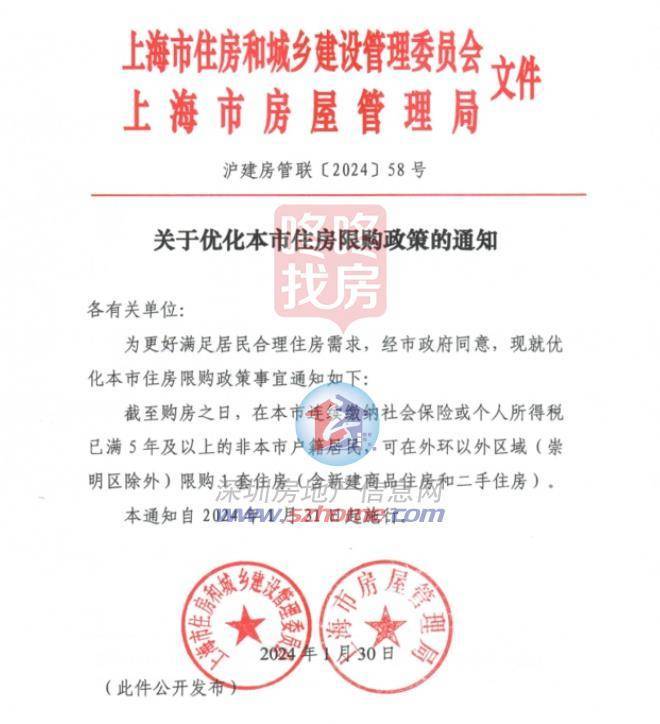 1月30日,上海住房城乡建设管理委、房屋管理局联合印发《关于优化本市住房限购政策的通知》,规定自1月31日起,在上海市连续缴纳社会保险或个人所得税已满5年及以上的非本市户籍居民,可在外环以外区域(崇明区除外)限购1套住房。
