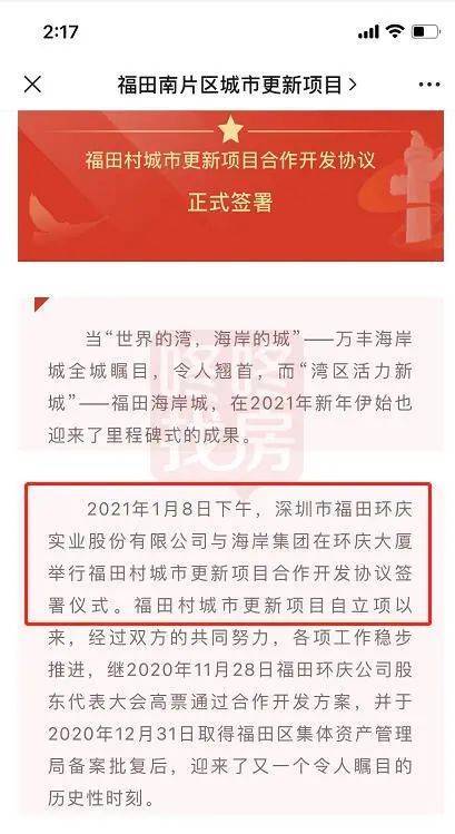 据订阅号@福田南片区城市更新项目(账号主体为深圳市海岸城置业有限公司)消息,2021年1月8日,深圳市福田环庆实业股份有限公司与海岸集团签署福田村城市更新项目合作开发协议。海岸集团表示,为福田村奉献一座5.0版本的海岸城。