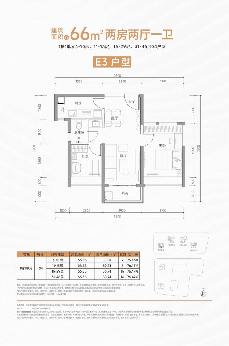 其中67㎡的E1、E2户型为经典竖厅,E2户型客厅开间3.1米,U型厨房设计;66㎡的E3户型为双龙抱珠户型,双卧室带大飘窗,主卧开间3.1米,空间感十足。