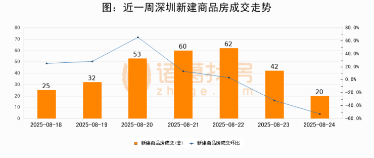 根据深圳市住房和城乡建设局数据显示,2025年08月24日深圳新建商品房成交20套,较昨日减少22套,环比下降52.4%。近一周深圳新建商品房日均成交42套。08月24日单日成交20套,低于近一周平均水平52.4%。
