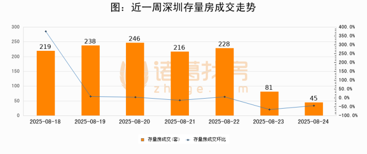从存量房来看,2025年08月24日深圳存量房单日成交45套,比昨日减少36套,环比下降44.4%。从近一周存量房成交来看,深圳存量房日均成交套数为181套,08月24日单日成交45套,低于近一周平均水平75.1%。