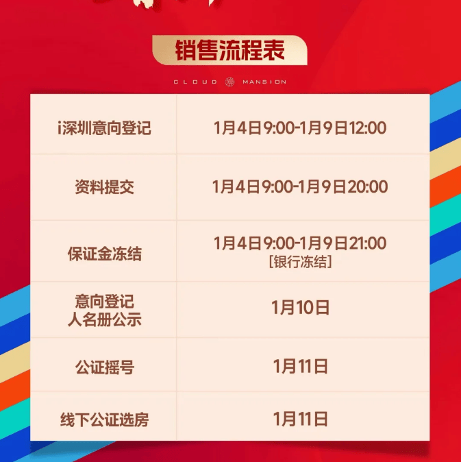 项目销售流程如下,登记时间为1月4日-1月9日,1月11日正式线下选房。