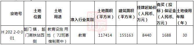该地宗地号H2022-0001,土地位置鲘门镇,鲘门高铁站西侧,土地用途教育设施用地 (72班寄宿制高中),准入行业类别教育,土地面积117414平方米,建筑面积155163平方米,挂牌起始价8440万元,土地使用年限30年。