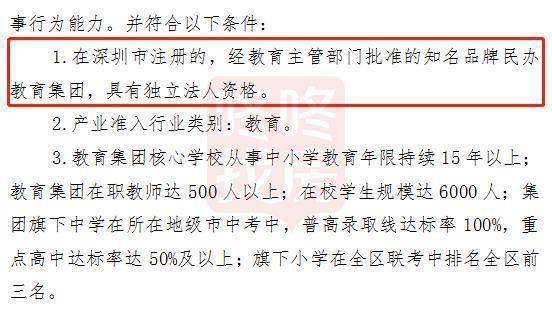 学校举办者基本条件显示,学校举办者基本条件中,提到须为在深圳市注册的,经教育主管部门批准的知名品牌民办教育集团。