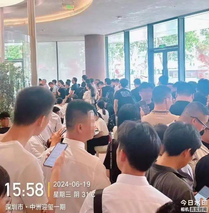 这是位于深圳北站的中洲迎玺项目,二期于昨日(6月19日)晚上拿证,且拿证即开盘,不需要摇号,客户先到先得,因此从昨日下午开始,营销中心就挤满了人群。