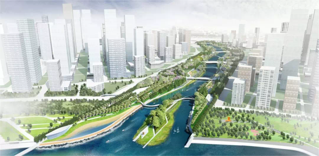 白色钢箱拱形似倾斜的圆弓横跨铲湾河水廊道,远观桥形好似两片相近飞舞的蝴蝶翅膀,拱肋从外向往道路中心线侧倾斜,划出两道漂亮弧线,桥下的铲湾河水廊道波光粼粼,清澈的水面偶有鱼儿翻滚游动……记者走到二号桥景观桥,放眼望去,刚刚竣工交付不久的前海深港设计创意产业园坐落桥旁,听海大道路侧的朴树昂扬挺立,灌、乔、花、草郁郁葱葱,形成了一条满眼透绿的景观生态长廊。来到二号桥中心仰视妈湾中心区,高楼林立、错落有致。