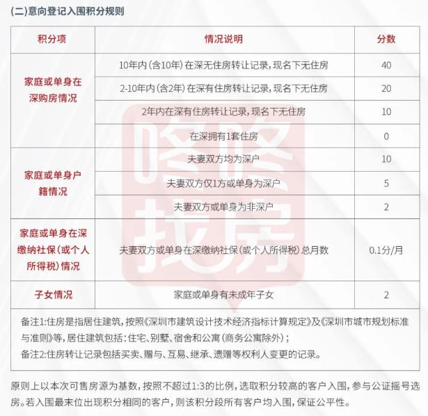 值得一提的是,该项目深圳新盘在一段时间“无房、有房”分类入围后,再次使用积分入围方式,积分条件非常严格:10年内在深圳无住房转让记录,且名下无房,可积较高分40分,在深有一套房此积分项为0分,社保/个税0.1分/月,户籍状况、子女情况也有相应积分,但是最影响分数的仍然为名下房产情况以及社保/个税。