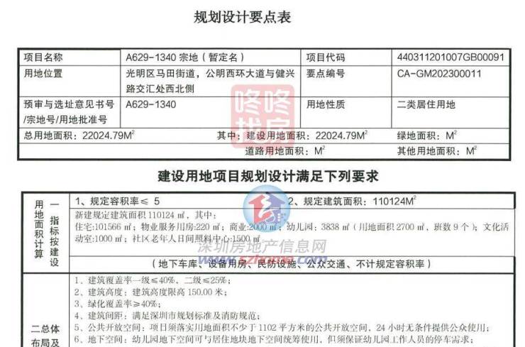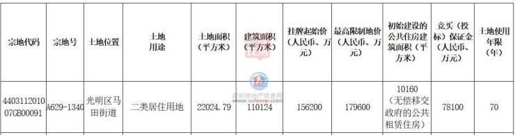 光明A629-1340宗地,建面约11万平,起始价15.62亿,初始建设的公共住房建筑面积10160平米(无偿移交政府的公共租赁住房)。