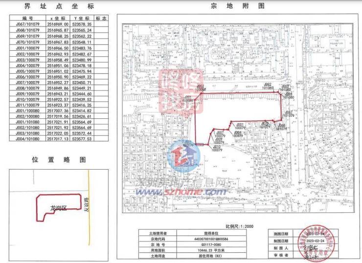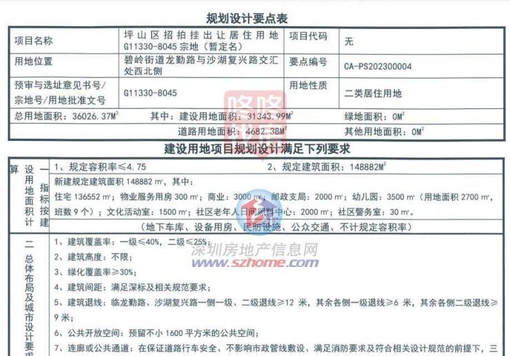 坪山G11330-8045宗地,此地块为二类居住用地+城市道路用地,建面约14.89万平,挂牌起始价15.49亿,初始建设的公共住房建筑面积23700平米(无偿移交政府的保障性租赁住房),普通商品住房平均销售价格不高于41000元/平方米(不含室内装修价格)。