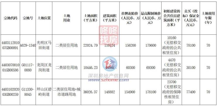 龙岗G01117-0080宗地,建面约4.89万平,挂起始价6.03亿,初始建设的公共住房建筑面积4470平(无偿移交政府的公共租赁住房),普通商品住房平均销售价格不高于39500元/平方米(不含室内装修价格)。
