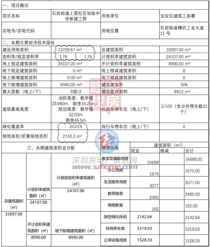 另一所,位于宝安的上屋社区初级中学《建设工程规划许可证》及总平面图对外公告。