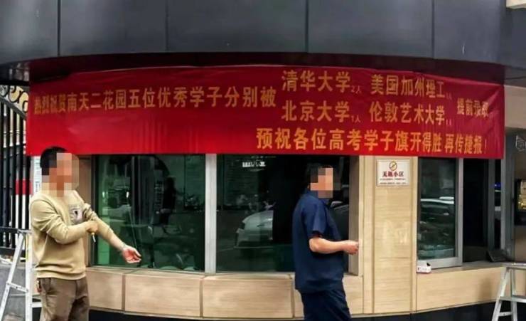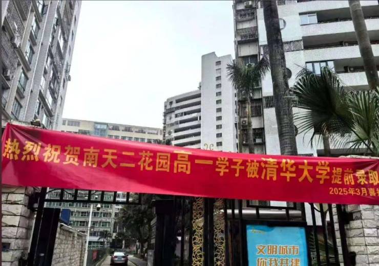 位于福田百花片区的南天二花园,因在小区大门挂上了“5位优秀学子被清北等名校提前录取”的大红喜报横幅,而引来热议。