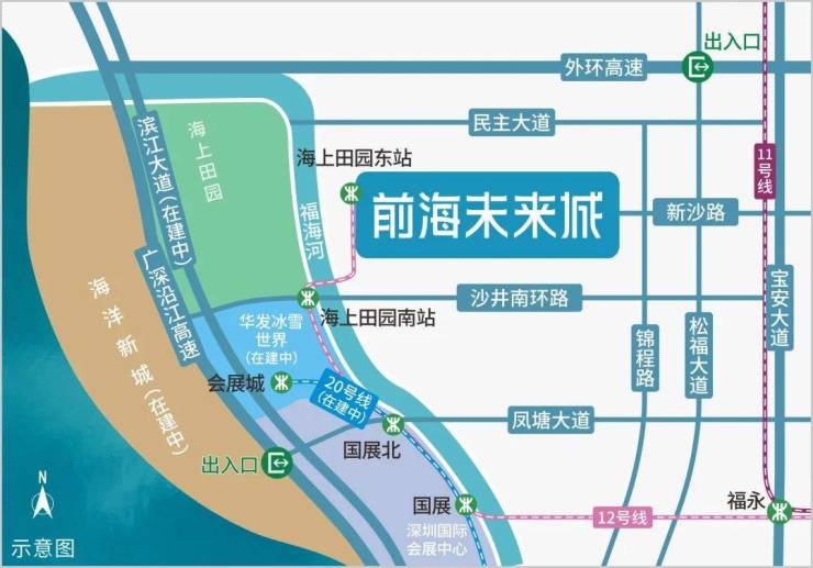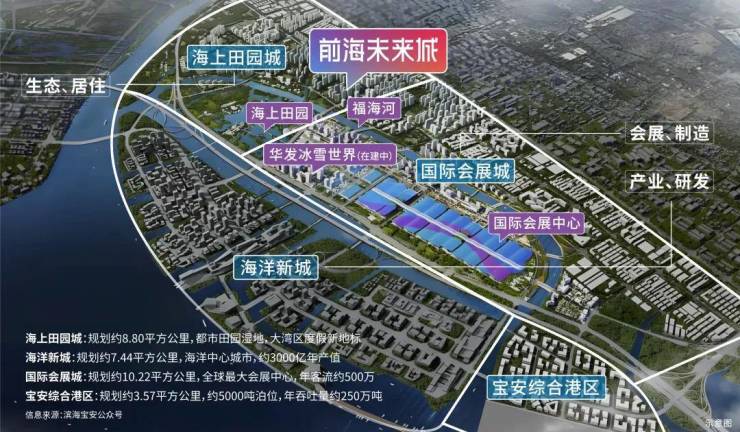 前海会展海洋城“三城一港”规划,包含国际会展城、海洋新城、海上田园城和宝安综合港区,形成深圳西部“南宝中、北会展”双中心发展格局,大量产业规划发展赋能,为区域腾飞注入了强大的动力。