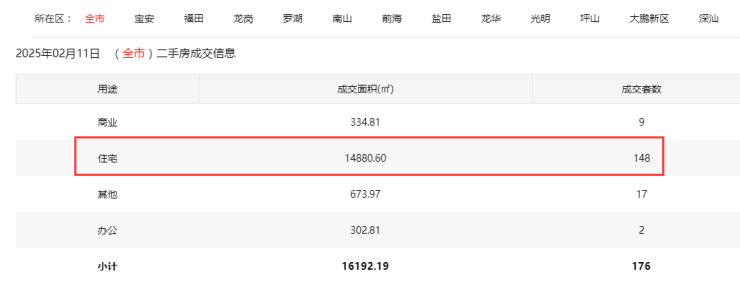 2025年2月11日二手房住宅网签148套。其中,宝安16套;福田22套;龙岗34套;罗湖14套;南山36套;盐田5套;龙华17套;坪山3套;光明1套;大鹏0套。