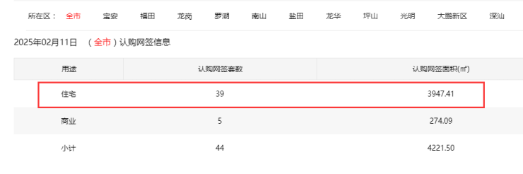 2025年2月11日新房住宅认购网签39套。其中,宝安9套;福田2套;龙岗8套;罗湖1套;南山1套;盐田3套;龙华9套;坪山2套;光明4套;大鹏0套;深汕0套。