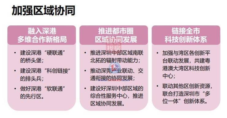 加强区域协同,融入深港多维合作新格局;推进都市圈区域协同发展;链接全市科技创新体系。
