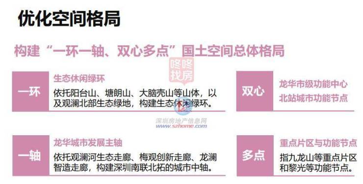“一环一轴、双心多点”的格局中,双心为龙华市级功能中心、北站城市功能节点;一轴为龙华城市发展主轴,重点片区与功能节点指九龙山等重点片区和黎光等功能节点。